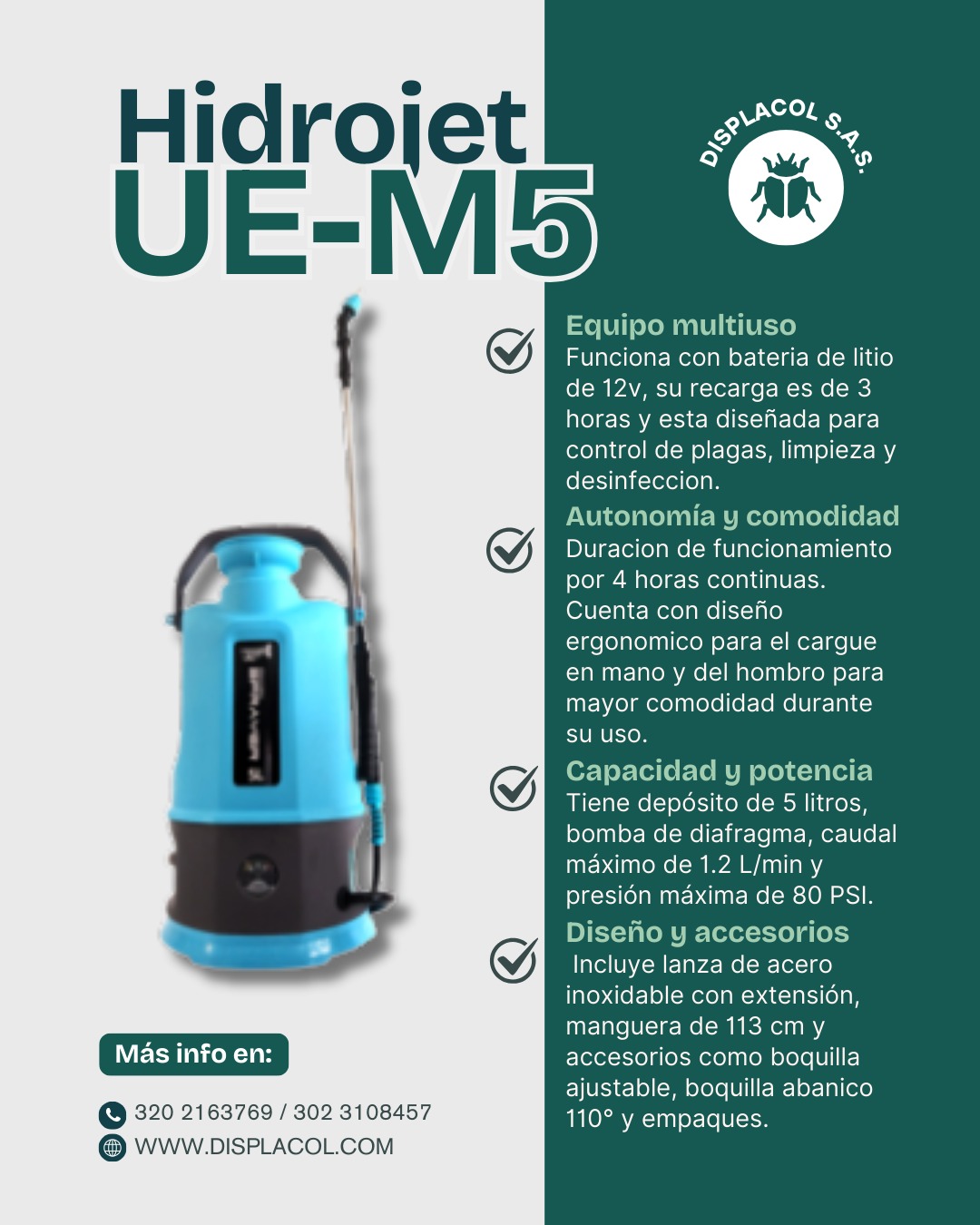 La fumigadora eléctrica Hidrojet 5 litros es un equipo profesional diseñado para ofrecer eficiencia, comodidad y alto rendimiento en aplicaciones de control de plagas, limpieza y desinfección. Además, su diseño ergonómico y su batería de litio recargable permiten trabajar con mayor comodidad durante largas jornadas.