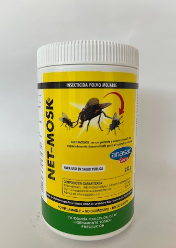 Dosis Insecticida para moscas Net mosk: Mezclar 250 g en 5 litros de agua y asperjar 50 m² de piso o 120 m² de paredes.