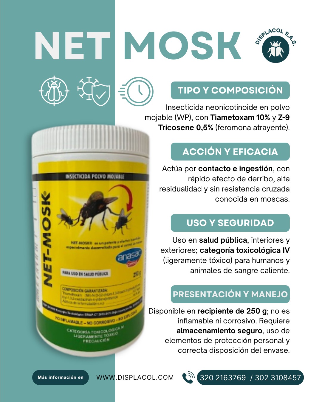 Insecticida para moscas Net mosk, Posee potente insecticida sistémico de segunda generación de la familia de los neonicotinoides con actividad por contacto e ingestión.